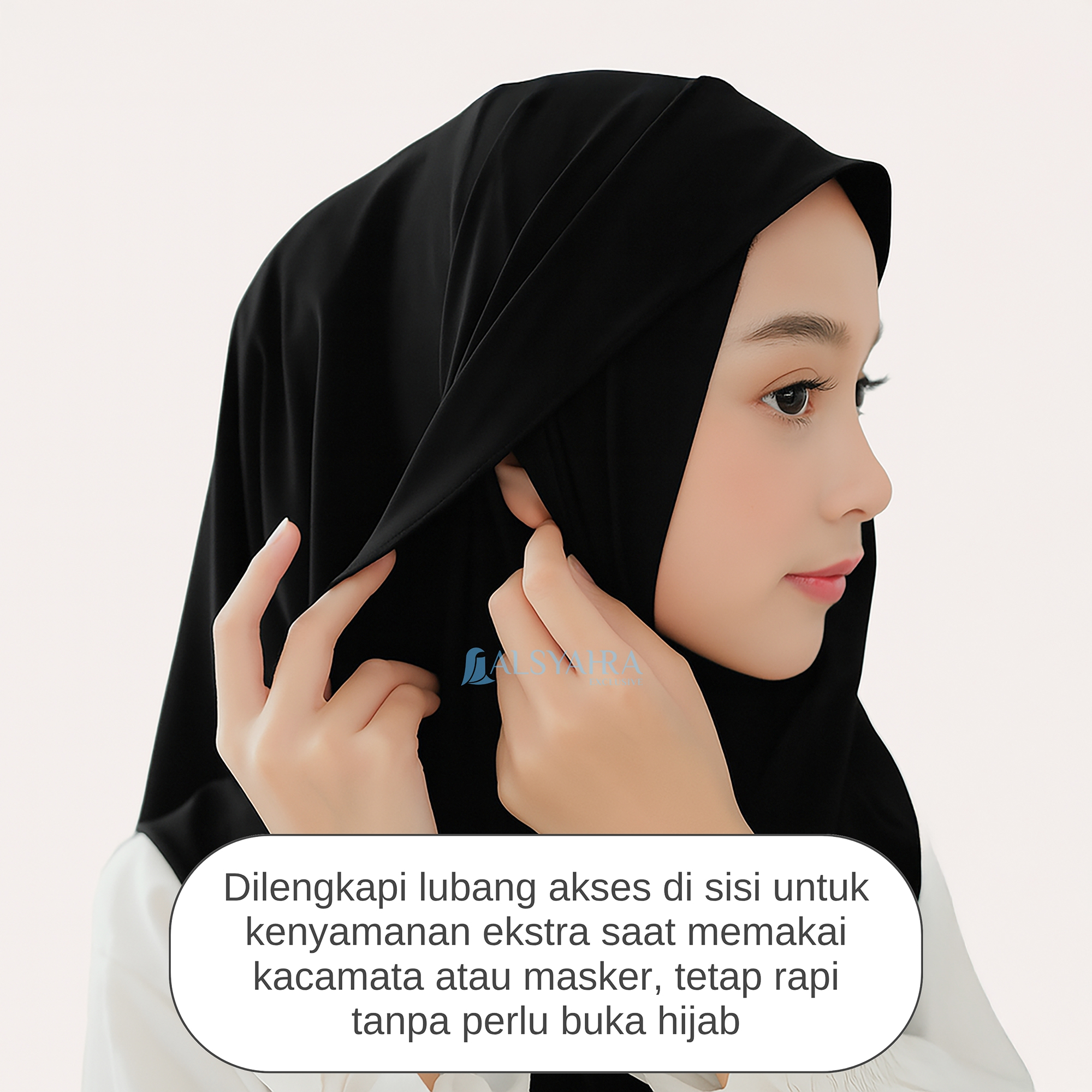 - Dilengkapi lubang akses di sisi untuk kenyamanan ekstra saat memakai kacamata atau masker, tetap rapi tanpa perlu buka hijab