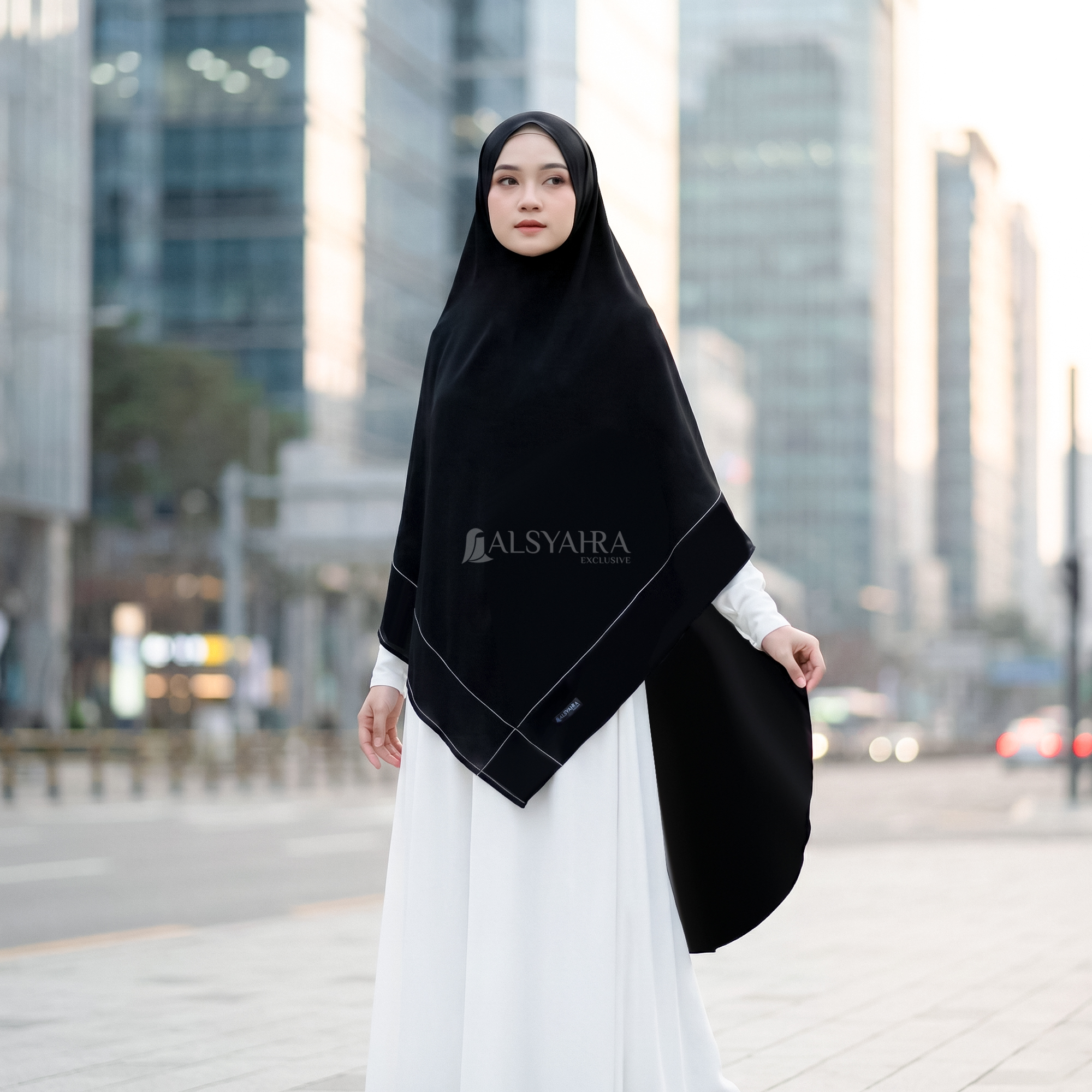 Bagian paling ikonik dari seri Maryam ini adalah list putih signature khas Alsyahra garis lembut yang mengikuti alur tepian kerudung, memberi sentuhan estetik yang rapi, clean, dan eksklusif tanpa mengurangi kesan syari. List putih ini juga membuat jilbab terlihat lebih tegas dan elegan saat dipakai, terutama ketika bergerak.