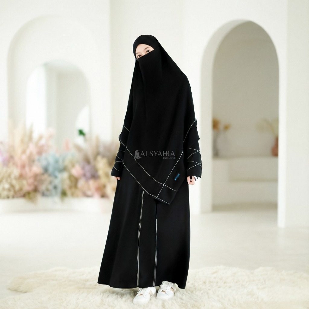 Tampil elegan dan syari seketika dengan One Set Abaya Medina dan French Khimar Maryam Size XL dari Alsyahra Exclusive.